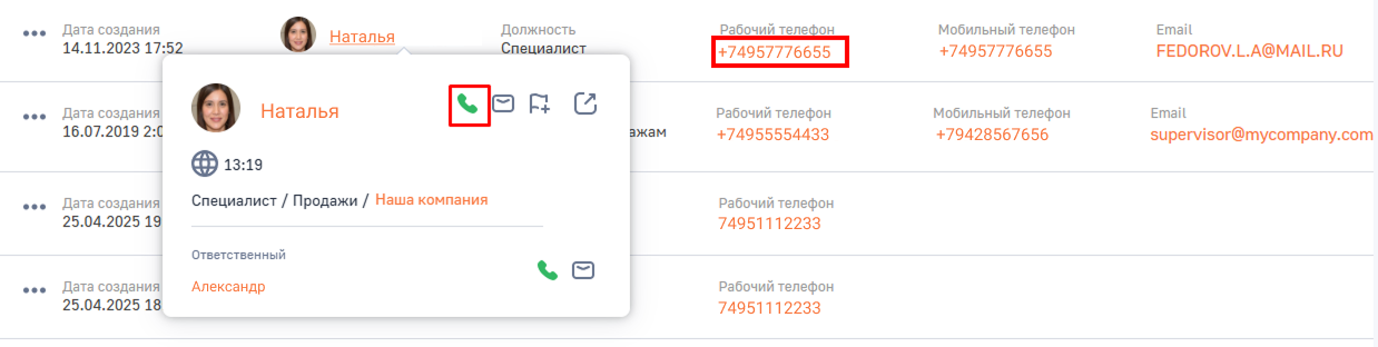Если сотруднику надо позвонить по ранее сохраненному номеру, он может совершить звонок в один клик из реестра записей или карточки контакта.