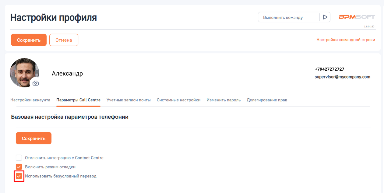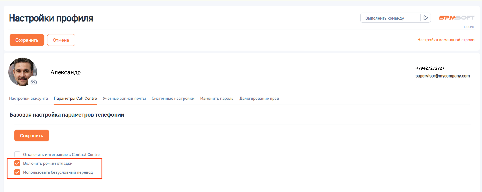 - Проверьте, что в настройках профиля на вкладке Call Centre в интерфейсе BPMSoft стоят соответствующие галочки (описано выше).