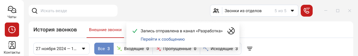 Появится окно с уведомлением об отправке записи. Из него вы можете перейти в чат, куда отправлена запись.