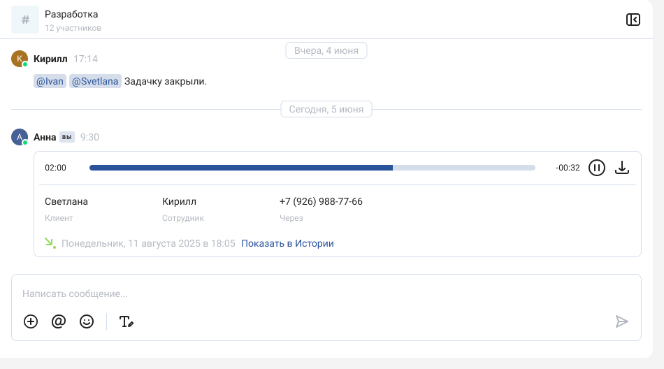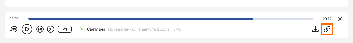 Чтобы поделиться записью звонка в чате, в проигрывателе нажмите на иконку ссылки в правом нижнем углу.