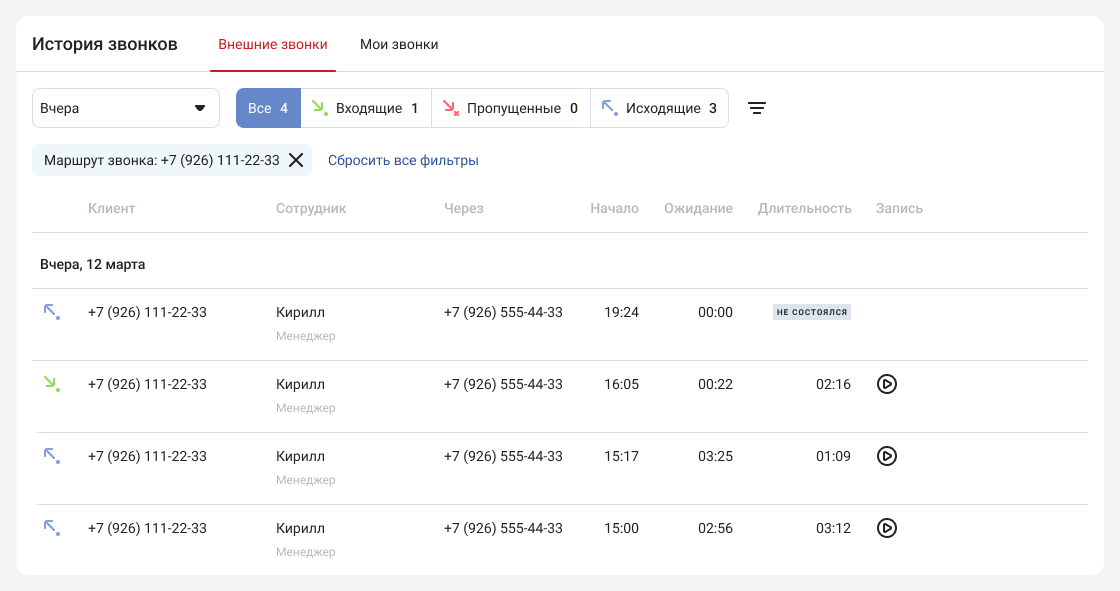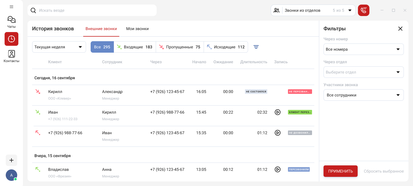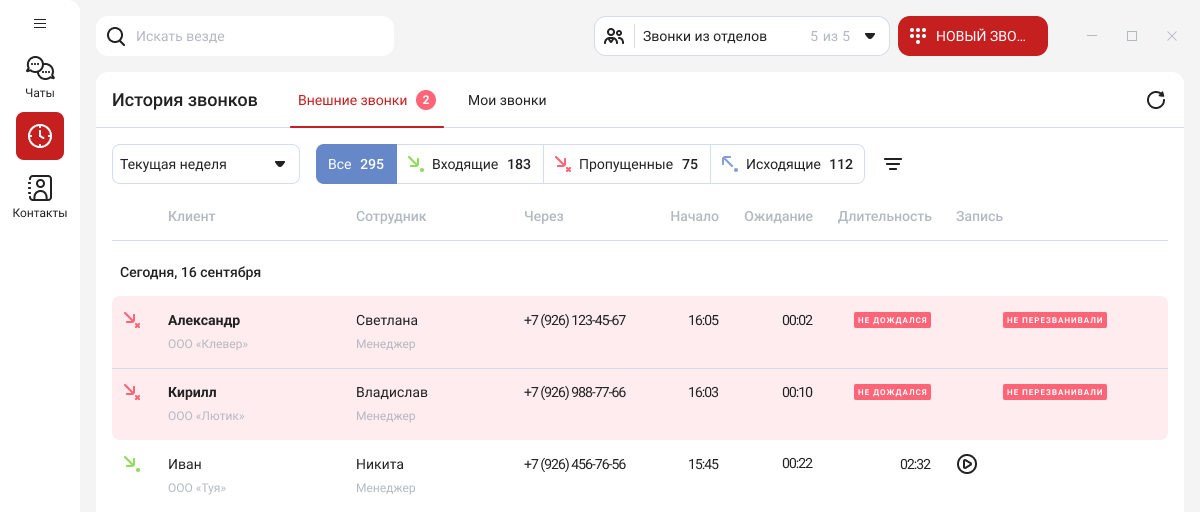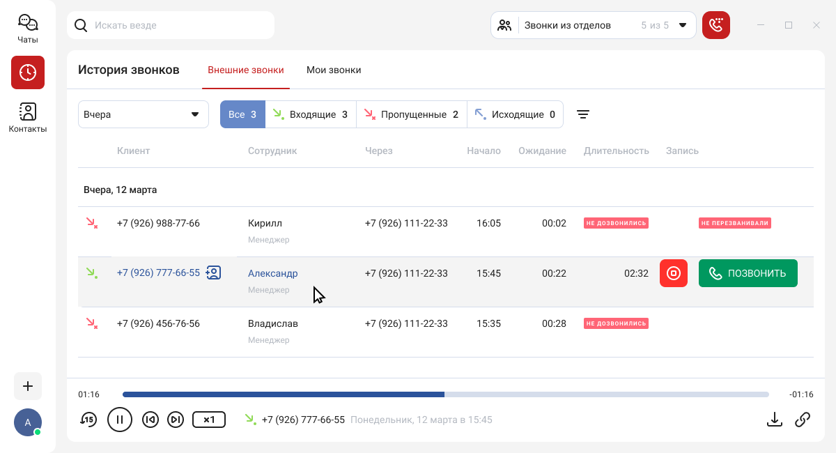 Благодаря фильтру «Контроль пропущенных» вы сможете легко найти непринятые звонки, на которые сотрудники не перезванивали или не дозвонились.