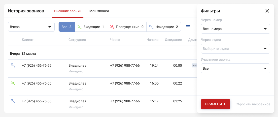 Выберите нужные вам значения фильтров и нажмите «Применить». В таблице останутся только те звонки, которые соответствуют заданным параметрам.