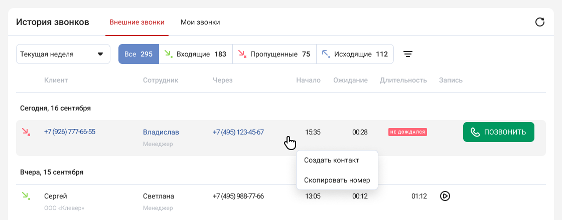 Чтобы перезвонить по пропущенному, наведите курсор на соответствующую строку и нажмите на кнопку «Позвонить» справа.