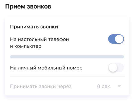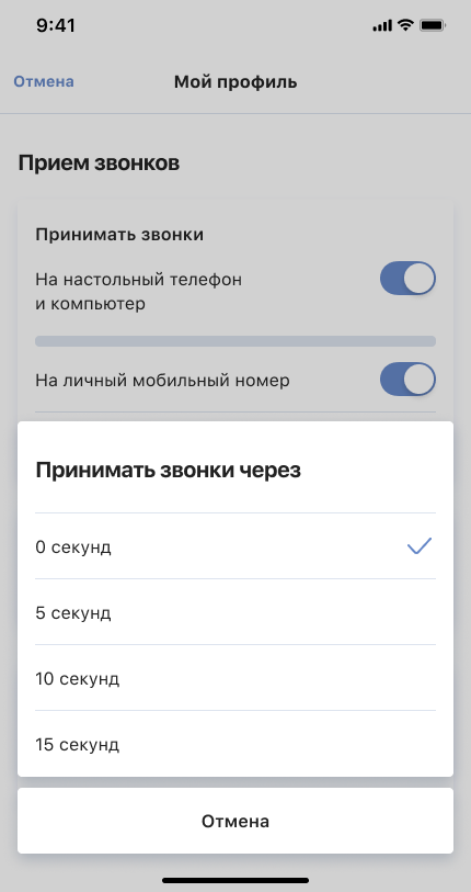 Если сотрудник чаще находится на рабочем месте и сразу может ответить с настольного телефона или компьютера, рекомендуем настроить задержку перед переадресацией звонка мобильный. Так, звонок сначала поступит на офисные устройства, а лишь затем на личный мобильный номер. Под нужным способом приема звонков нажмите «Принимать звонки через» и выберите комфортную задержку для переадресации.