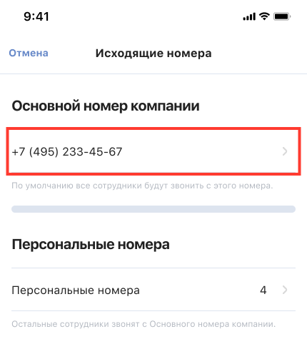 Перейдите в «Настройки» — «Настройки ВАТС» — «Дополнительные настройки» — «Общие» — «Исходящие номера» — «Основной номер компании».