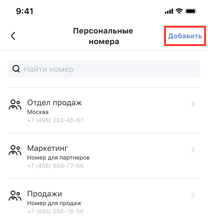 Откроется список настроенных персональных номеров. Нажмите «Добавить», чтобы выбрать персональный номер для сотрудника или отдела.