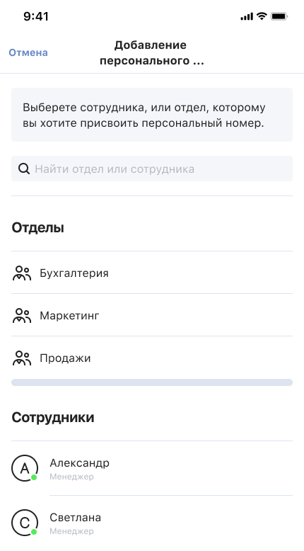 Добавление персонального номера для сотрудника или отдела