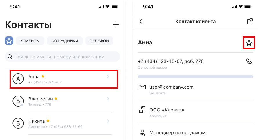 Чтобы добавить контакт в избранное, нажмите на имя контакта в соответствующем разделе, а затем — на звездочку в правом верхнем углу.