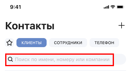 Чтобы найти контакт по имени, номеру телефона или названию компании, воспользуйтесь поисковой строкой вверху экрана.