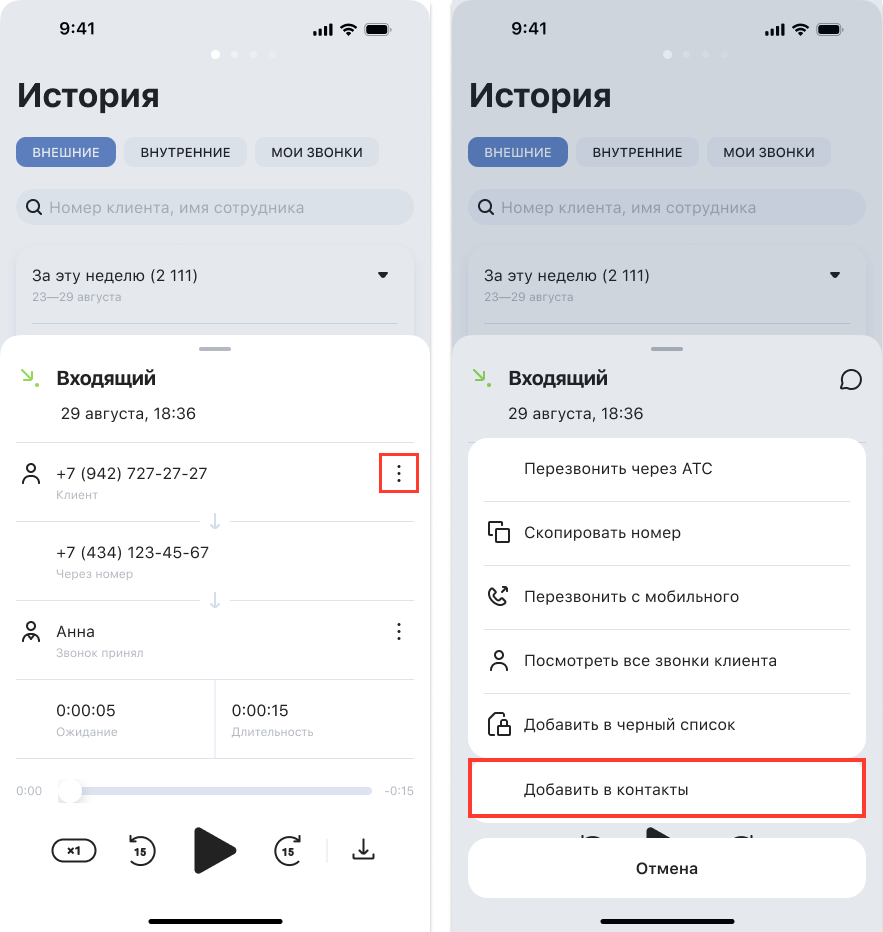 Добавить контакт из истории можно двумя способами: длинным нажатием на звонок и из карточки вызова.