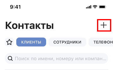 Чтобы добавить контакт, которого нет в истории, перейдите в раздел «Контакты» и нажмите на плюс в правом верхнем углу.