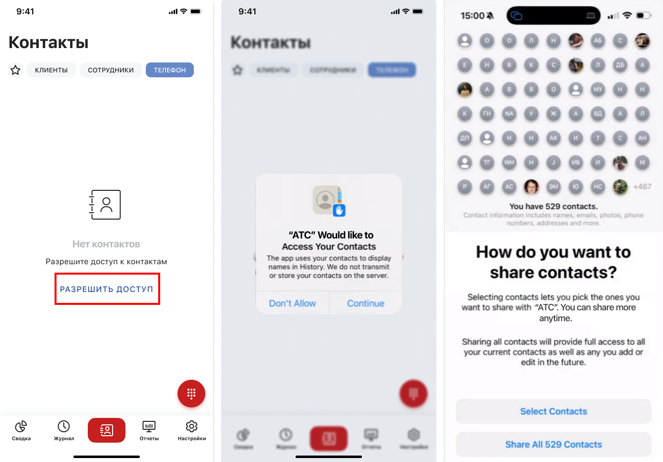 Чтобы добавить контакты со смартфона, на вкладке «Телефон» нажмите на кнопку «Разрешить доступ» . Дальнейшие шаги зависят от типа операционной системы: