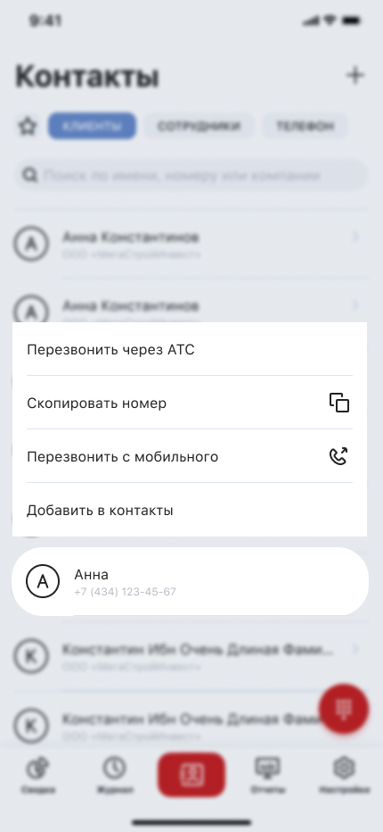 Для удобства контакты разбиты на вкладки «Клиенты», «Сотрудники» и «Телефон» (контакты с вашего устройства). Также контакты, которыми вы часто пользуетесь, можно добавить на вкладку «Избранное» с иконкой звездочки.