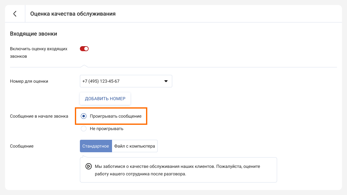 3. Для повышения процента отклика активируйте функцию «Проигрывать сообщение» в начале звонка. Данное аудиосообщение проинформирует абонента о последующем опросе. Вы можете использовать стандартное сообщение или загрузить свой файл с устройства для кастомизации процесса под ваш бренд.