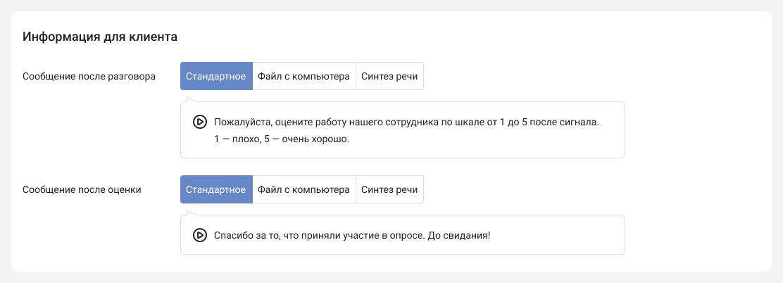 5. Если прямо сейчас у вас нет уникального брендированного аудиосообщения — не проблема! В любой момент можно заменить стандартные сообщения с предложением оценить качество обслуживания и благодарностью за оценку на свои файлы.
