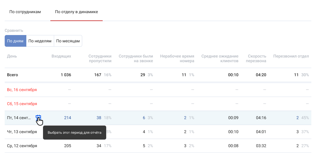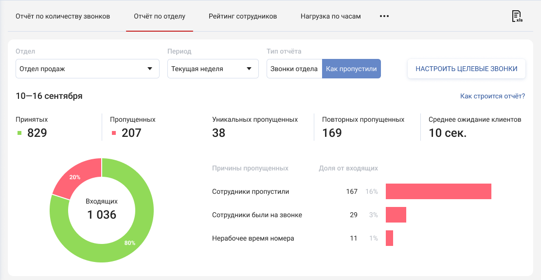 • разбираться, почему звонки в отдел остались без ответа и кто из сотрудников чаще их пропускает.