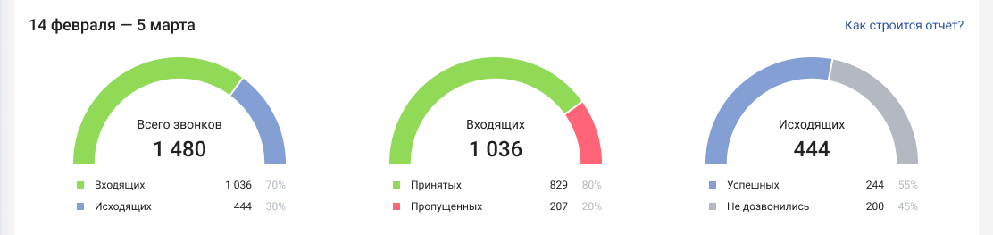 В отчете отображаются сводные данные обо всех звонках за выбранный период (день, неделя, месяц и т.д.). Каждый из счетчиков отвечает на ключевые вопросы руководителя: