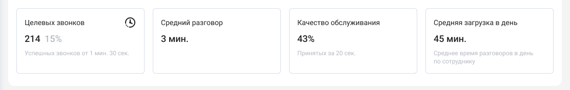• Длительность среднего разговора — как долго в среднем длится один разговор. Если он сильно отличается от целевых значений, значит, с сотрудниками пора проводить обучение;