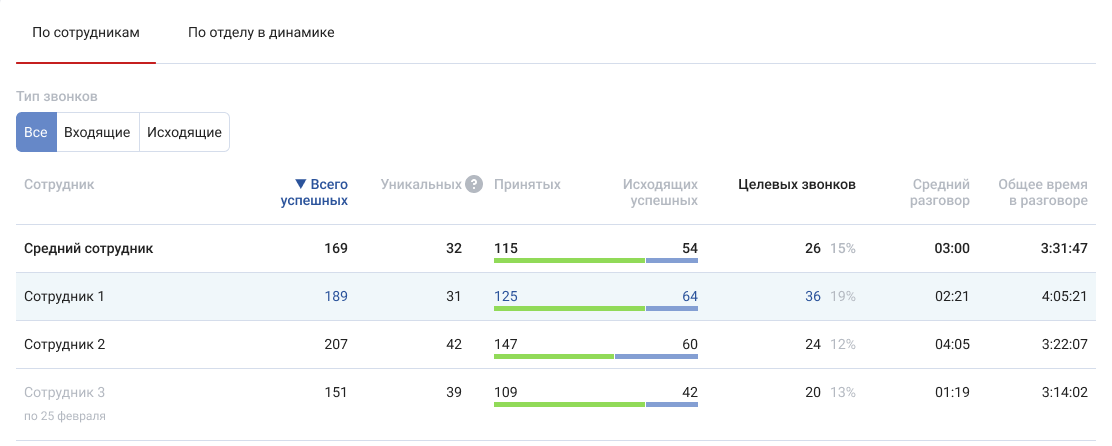 Для оценки вклада каждого сотрудника в результаты отдела используйте таблицу по звонкам сотрудников: по всем вызовам или отдельно по входящим и исходящим.