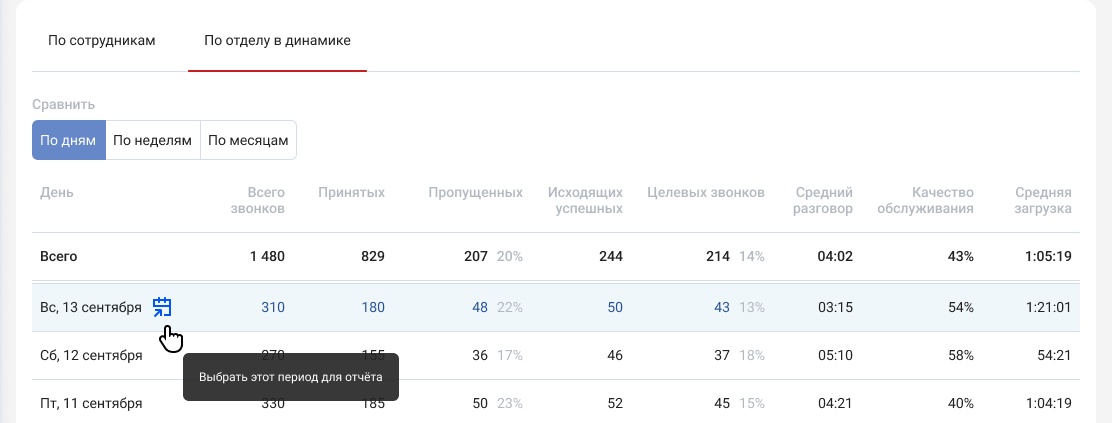 Подробнее изучить отчет по звонкам отдела за интересующий период можно одним кликом, нажав на иконку календаря.