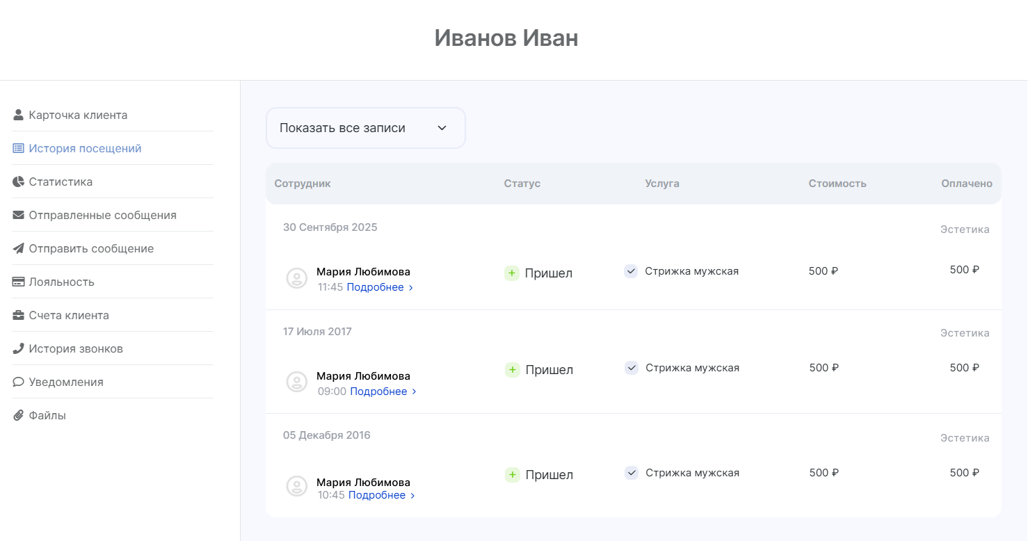 Чтобы посмотреть историю посещений определенного клиента, перейдите в раздел «Клиенты» — «Клиентская база». Найдите нужного клиента с помощью поисковой строки, введя его имя или фамилию, и нажмите кнопку «Показать».