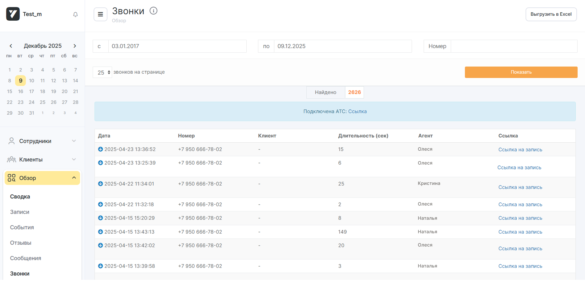 Записи всех звонков хранятся не только в карточке клиента, но и в общей истории вызовов. Это помогает при решении спорных ситуаций и при обучении сотрудников.